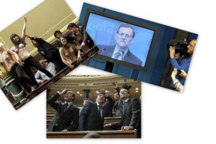 La medalla de bronce prácticamente la comparten la imagen de María Dolores de Cospedal durante su juicio contra Bárcenas (que también aparece en un plasma) y las Femen protestando en el Congreso contra la reforma del aborto. Han logrado el 7,73% y el 7,21% de los votos respectivamente.