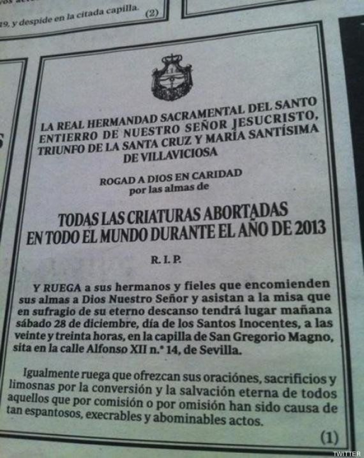 Este viernes, en las páginas de ABC había una esquela en la que se leía: "Rogad a dios en caridad por las almas de todas las criaturas abortadas en el mundo el año de 2013". Quien colocó el mensaje fue la Real Hermandad Sacramental del Santo Entierro de Sevilla, que este sábado organizó una misa con ese objetivo.