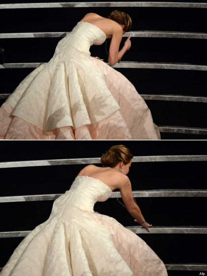 "Estaba en los Oscar, esperando a ver si decían mi nombre, y no paraba de pensar 'cakewalk, cakewalk' (en inglés, 'cake' significa 'tarta' y 'walk', 'andar'). Y pensé: '¿Por qué no paro de pensar en eso?'. Y según empecé a subir las escaleras y me pisé el vestido, recordé lo que me había dicho mi estilista: 'Kick, walk, kick, walk' ('kick' es golpear). Se supone que hay que dar un golpe al vestido hacia delante cuando vas caminando. ¡Y a mi se me olvidó por completo porque no paraba de pensar en tartas! Y por eso me caí".