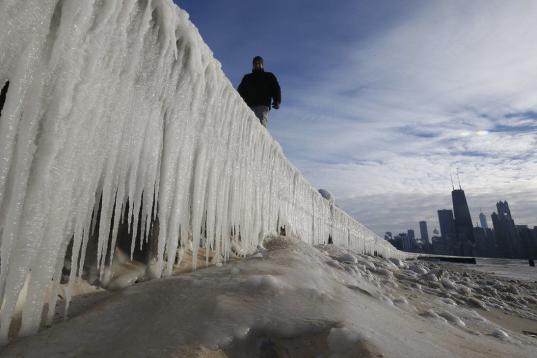 Un ciudadano observa un muro de hielo formado alrededor de una playa, en Chicago