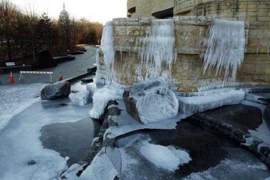 Una cascada del exterior del Museo Nacional del Indio Americano en Washington, completamente helada