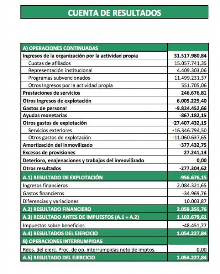 El resultado de explotación da unas pérdidas cercanas al millón de euros (956.676 de euros), que se compensan con los 2 millones recaudados por ingresos financieros provenientes de beneficios de empresas propias y rendimientos de cuentas bancarias, lo que permitió unas ganancias después de impuestos de 1.054.227 euros.