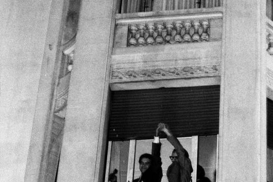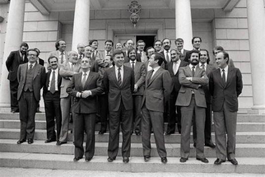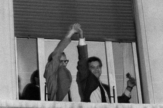 La mítica imagen de la victoria del hotel Palace de Madrid. González y Alfonso Guerra celebran el triunfo del PSOE en las elecciones de 1982. Se iniciaba el cambio en España.
