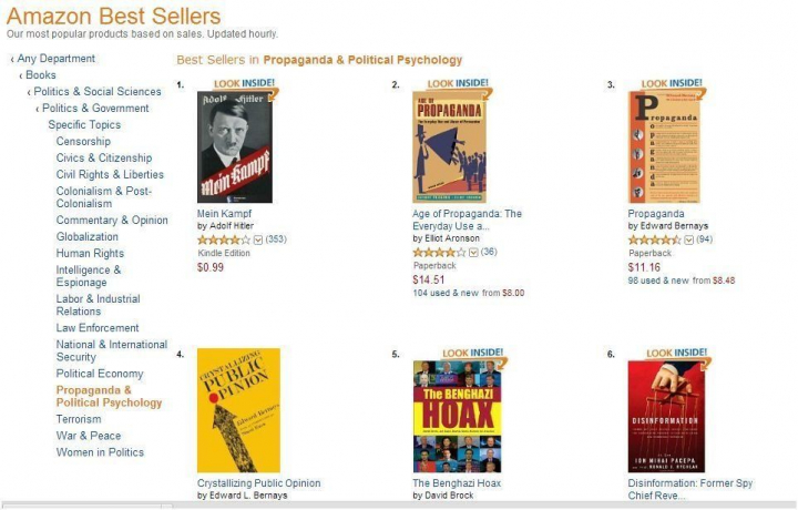 La obra, cuya impresión supone en algunos países el pago de una multa e incluso pena leve de cárcel, se sitúa, 89 años después de su publicación, en el puesto número uno de los libros digitales más vendidos de la sección ‘Propaganda y Psicología política’ en Amazon EEUU. Sin llegar a la cima, sí ocupa un puesto más que honroso en iTunes, la tienda de Apple: 12º lugar en la categoría de Política y Actualidad.