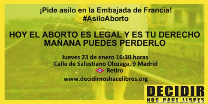 La lucha contra la reforma del aborto que prepara el Gobierno de Mariano Rajoy se expande. La Plataforma Decidir Nos Hace Libres ha convocado a mujeres, hombres y profesionales médicos a acudir a la embajada francesa en Madrid el próximo jueves 23 para solicitar "protección jurídica y asilo".