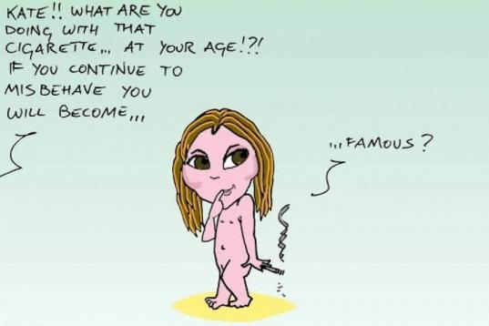 "Kate, ¿Qué haces con un cigarrillo a tu edad? Si sigues comportándote así vas a ser...". "¿Famosa?", dice la modelo Kate Moss.
