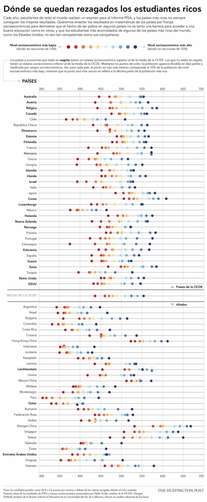 El WorldPost obtuvo los datos gracias a Pablo Zoido, analista de la Organización para la Cooperación y el Desarrollo Económicos (OCDE), el grupo encargado de elaborar el informe PISA. La infografía muestra que la riqueza de los estudiantes no los hace necesariamente más competentes a escala internacional.