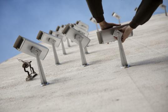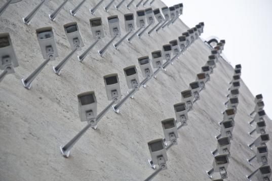 No están en funcionamiento. Se trata de la "instalación de 150 cámaras de seguridad falsas sobre la fachada de un edificio con el propósito de no vigilar nada", tal y como se explica en la web del artista urbano SpY -rebautizado por algunos como el Bansky madrileño. Además, a ninguno se le pone cara porque están empeñados en preservar su anonimato.