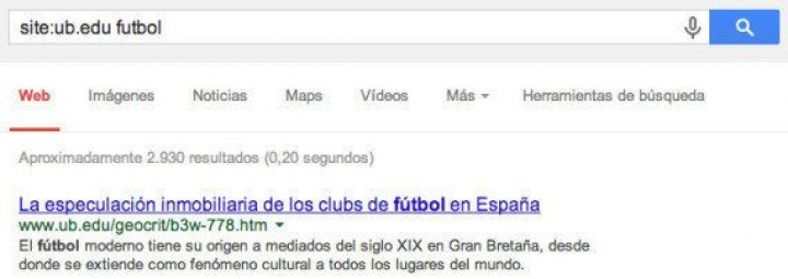 Tal vez llevas media hora buscando información básica en el sitio web cutre de tu colegio. Si tecleas "site:ub.edu", por ejemplo, antes de escribir tu búsqueda, los resultados se limitarán a la Universidad de Barcelona.