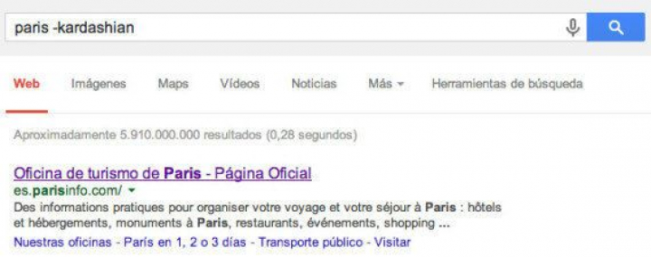 Utiliza un guión para filtrar los resultados que no deseas. Escribiendo "Paris -Kardashian" conseguirás planear tus vacaciones sin que los planes de boda de Kim se cuelen en tu búsqueda.