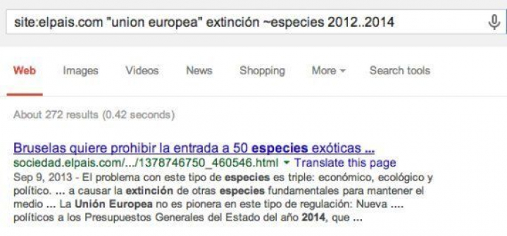 Escribe "site:elpais.com" para acotar la búsqueda al sitio. Escribe también "unión europea" (entre comillas, para que reconozca la frase entera) y luego "extinción" sin nada y "~especies" para que busque también palabras relacionadas como "animales". Finalmente, "2012..2014" (con dos puntos) te dará los resultados publicados en esa franja de tiempo.