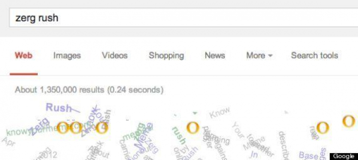 Teclea "Zerg rush" en Google. Un Zerg rush, para los que no estén familiarizados, es como el término que se usa en el juego de StarCraft cuando reúnes guerreros alienígenas llamados Zerg para masacrar al ejército contrario. Si haces doble click, tu cursor se convertirá en un arma contra las 'O' atacantes (la version de Google de los Zergs).