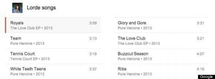 Si buscas "canciones de Lorde" aparece la lista de arriba, junto a una pequeña biografía del neozelandés. Si pinchas en cada canción aparecerán sus vídeos de YouTube y algunas canciones se pueden escuchar directamente desde Google.