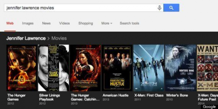 Si tecleas "Jennifer Lawrence películas" en Google aparecerá una estupenda galería de su filmografía. Lo mismo pasa con la discografía de los músicos (intenta buscar "The Beatles albums").