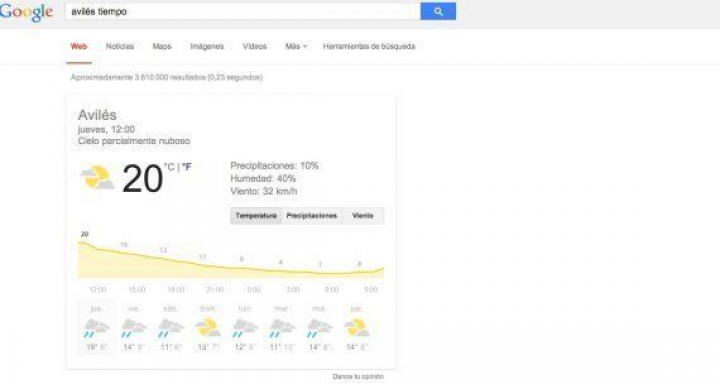 Sólo escribe "tiempo" y el nombre de la localidad y Google destacará un recuadro con las predicciones de otros sitios.