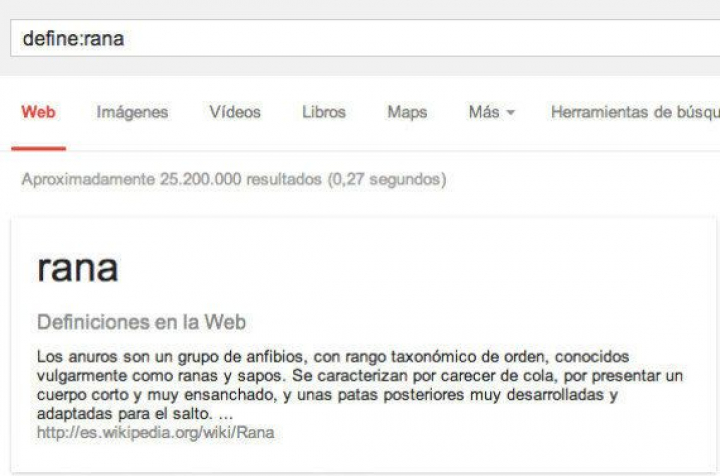 Teclear "define:" antes de cualquier palabra te dará su definición. Google también revisa la ortografía (si te equivocas te ofrecerá una búsqueda del término correcto que más se parezca a lo que escribiste). Para palabras en inglés, Google también sirve para conocer de dónde vienen las palabras: escribe "etymology" junto a una palabra y te dará sus orígenes lingüísticos.