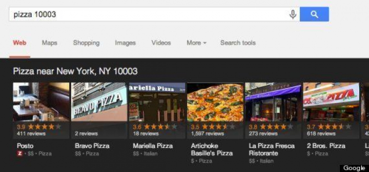 Escribe "pizza" y tu código postal. También puedes usarlo para otro tipo de comida a domicilio, buscar restaurantes por tipo de cocina, bares o incluso tiendas de ropa o de alimentación. En español no se presenta de forma tan vistosa como se ve arriba y sólo aparece una lista de resultados con un Google Maps al lado donde indica su localización.