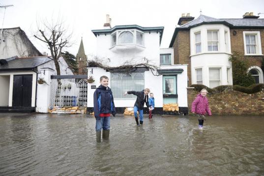 Un grupo de niños juega en una calle inundada en Datchet, cerca de Londres. La respuesta del Gobierno a las inundaciones está recibiendo críticas de muchos ciudadanos que viven en las zonas más destrozadas por el temporal y que consideran q...