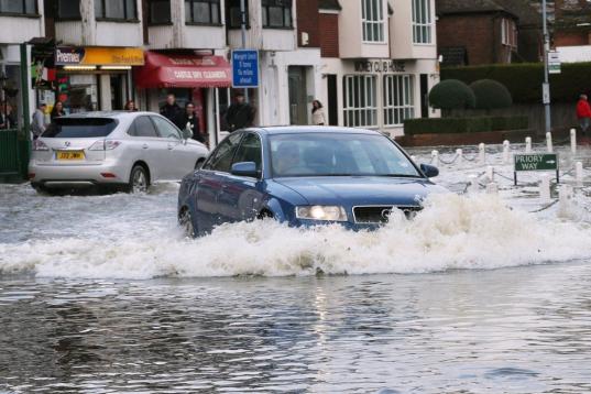 Un coche, en medio de la corriente de agua en la carretera principal de Datchet. La Agencia Medioambiental británica ha emitido alertas sobre inundaciones en zonas próximas a las orillas del Támesis, al oeste de Londres.