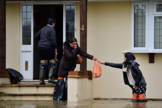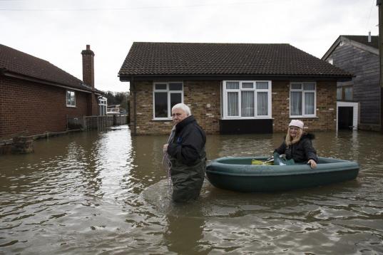 Vecinos que dejan su casa, afectada por las inundaciones, cerca de Londres. Los residentes de Wraysbury han tenido que abandonar sus casas y utilizan lanchas para recorrer las calles inundadas de la ciudad.