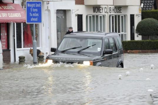 Un vehículo todoterreno avanza a través de una calle inundada en Datchet, cerca de Londres. Las autoridades han movilizado a 1.600 soldados para contribuir a las labores de ayuda.