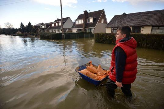Un niño lleva bolsas de arena en una carretilla en medio del agua en Wraysbury, Berkshire. Las calles de la localidad han quedado inundadas por el desbordamiento del río Támesis.