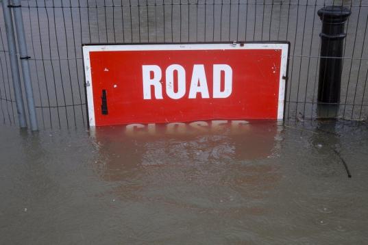 Un cartel de carretera cerrada, parcialmente sumergido en agua cerca de Londres, Reino Unido. El Servicio Metereológico (Met), ha anunciado para este martes y para este miércoles más lluvias y fuertes vientos provocados por una corriente proc...