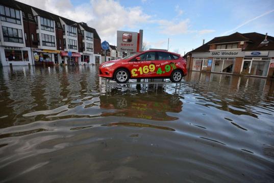 El agua casi alcanza a un coche sobre un expositor de un concesionario de Datchet. El Gobierno ha declarado 14 alertas graves y otras 350 menos severas.