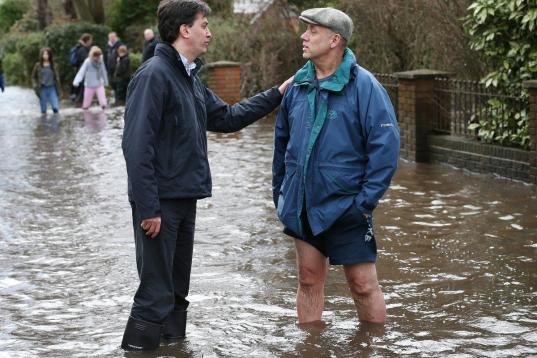 El líder del Partido Laborista, Ed Miliband, habla con un vecino en Wraysbury. Las lluvias han afectado también al servicio ferroviario que enlaza el suroeste con el resto del país, lo que ha forzado a ampliar las conexiones aéreas.
