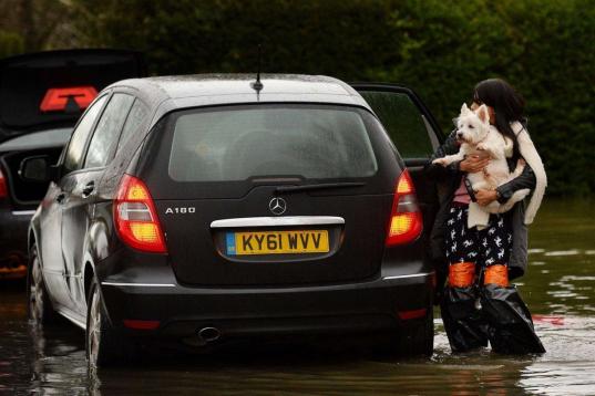 Una vecina de Wraysbury, Berkshire, lleva a su perro en brazos, mientras otros residentes empiezan a evacuar sus casas. El presidente de la Agencia Medioambiental, Chris Smith, ha defendido la gestión de su departamento y ha atribuido a las lim...