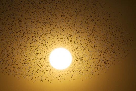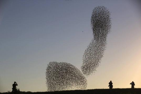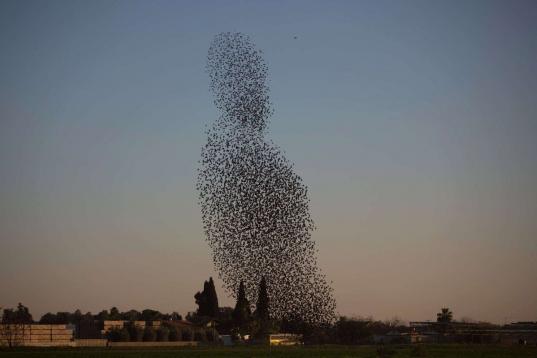 Según explica AFP en los pies de foto que acompañan a estas imágenes, esas formas en el aire son la danza tradicional de los estorninos antes de aterrizar al atardecer.