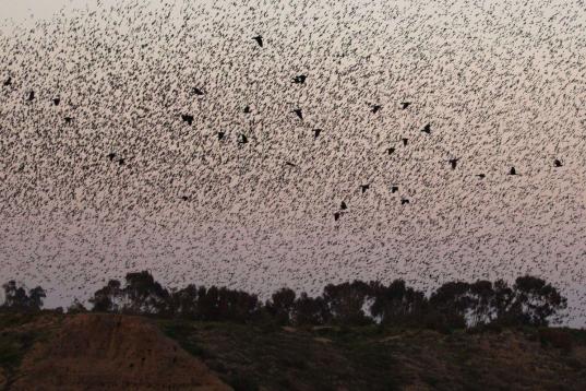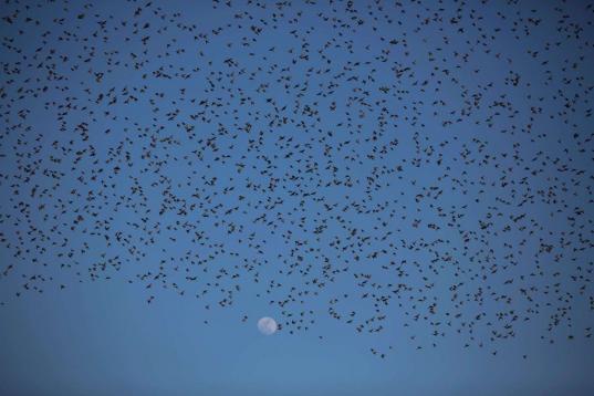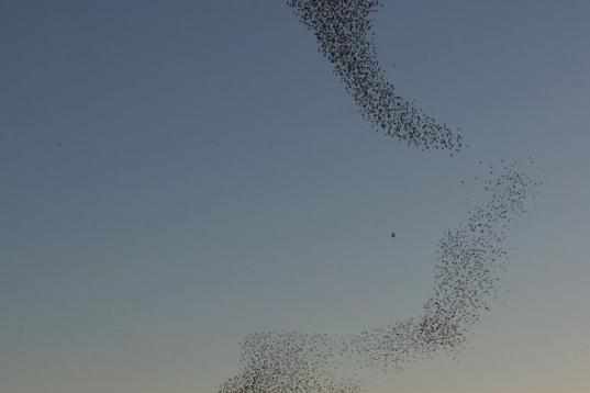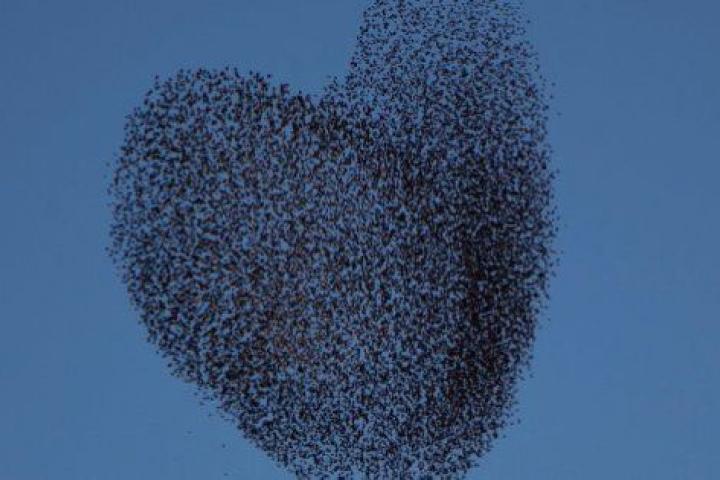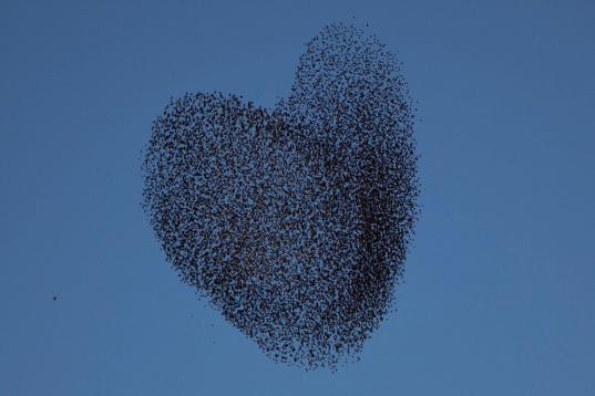 Estos días de febrero bandadas de estorninos están migrando. Su impresionante danza, que deja imágenes tan curiosas como formas de corazón en el cielo, ha sido captada por varios fotógrafos a su llegada a Israel. Pasan el invierno al sur del país, llegados de zonas Europa, del centro y del este del continente.