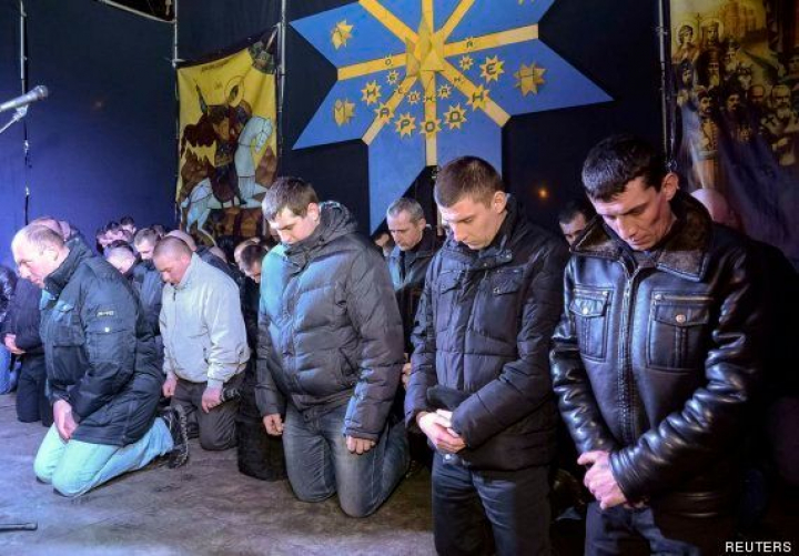 Perdón. De rodillas. Eso es lo que pidieron unos cien policías antidisturbios pidieron perdón de rodillas en la ciudad de Lvov, en oeste de Ucrania, antes de prometer estar junto al pueblo ucraniano a partir de ahora.