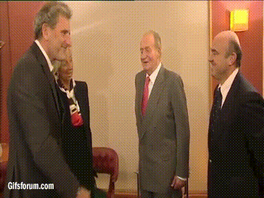 Junto al monarca estaba el ministro de Economía, Luis de Guindos, que ha saludado a Lagarde con una reverencia rozando la genuflexión que se ha convertido en objeto de mofa en la red social Twitter: