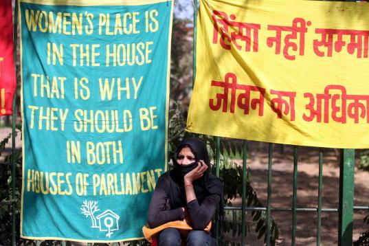 Una mujer india se sienta bajo una pancarta durante una manifestación con motivo del Día Internacional de la Mujer, en Nueva Delhi.