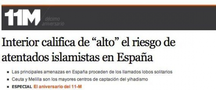 El diario El Paísse apoya en un informe del Ministerio del Interior que apunta a que el riesgo de atentados islamistas en España es "alto", por lo que el Gobierno tiene activado el nivel 2 de alerta ante lo que califican como "riesgo probable de atentado". "Las principales amenazas en el interior de España proceden de células locales autorradicalizadas o bien de lobos solitarios inspirados en la ideología de la yihad global de Al Qaeda, pero sin nexos directos con grupos terroristas", indica este periódico. Según el informe, la amenaza exterior más grave se sitúa en el Magreb-Sahel.