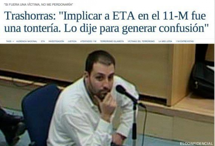 El otro testimonio ha sido el de José Emilio Suárez Trashorras, el exminero asturiano que suministró los explosivos a los terroristas. Desde la prisión de El Dueso en Cantabria, en la que se encuentra desde que fue condenado a 34.715 años, concedió una entrevista a El Confidencial en la que admitía que implicó a ETA en los atentados para "distraer" y reconoce que fue "una tontería".