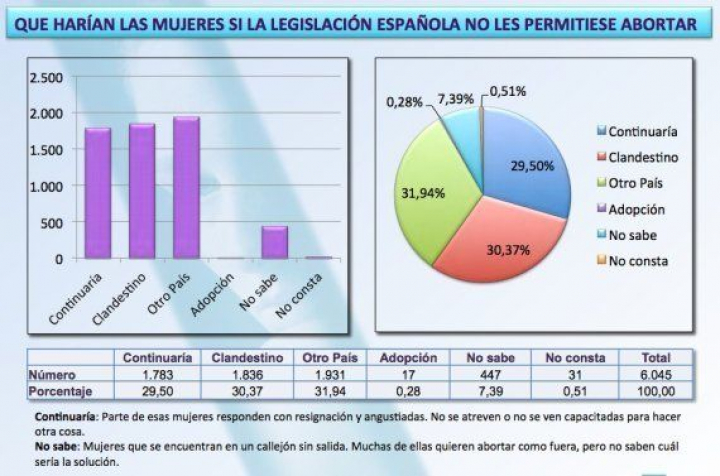 La encuesta, realizada a más de 6.000 mujeres que abortaron entre octubre de 2013 y el 15 de febrero de 2014 e incluida en el estudio Condiciones que motivan el aborto provocado, recoge que el 30,37% abortaría en España de manera clandestina y que el 31,94% lo haría en otro país.