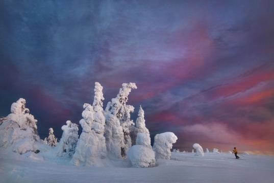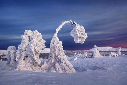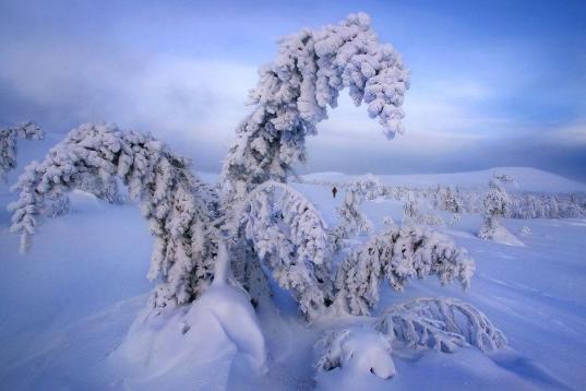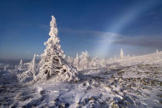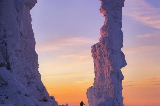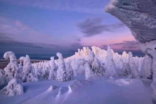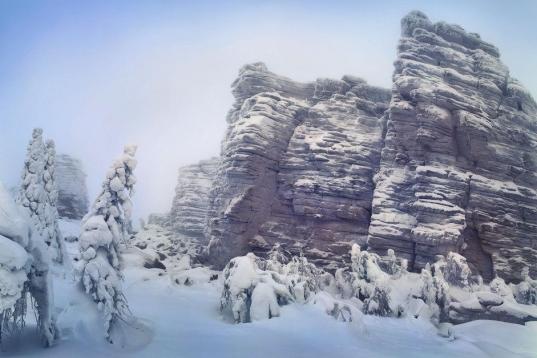 En invierno hay días en los que la temperatura baja hasta los -60ºC. Todo se hiela, hasta el vodka, y surgen paisajes que parecen no tener memoria. A pesar de que el pico más alto tiene apenas 1900 metros, el hielo y la nieve crean formas más allá del tiempo y el espacio.