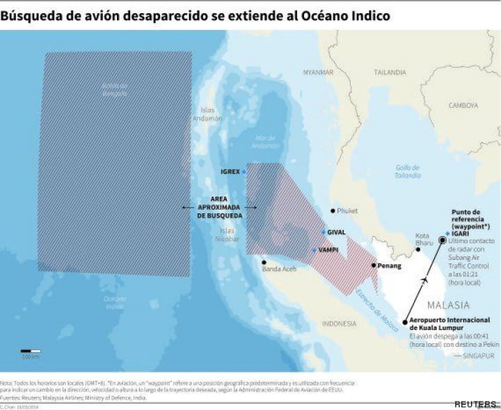 Los últimos datos de satélite recogidos señalan que el aparato pudo volar hacia el norte, en un área comprendida entre Laos y el mar Caspio, o hacia el sur, entre la isla indonesia de Sumatra y el sur del Índico.