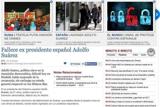 La muerte del expresidente del Gobierno Adolfo Suárez ocupa la sección de Internacional de los principales medios de comunicación extranjeros.