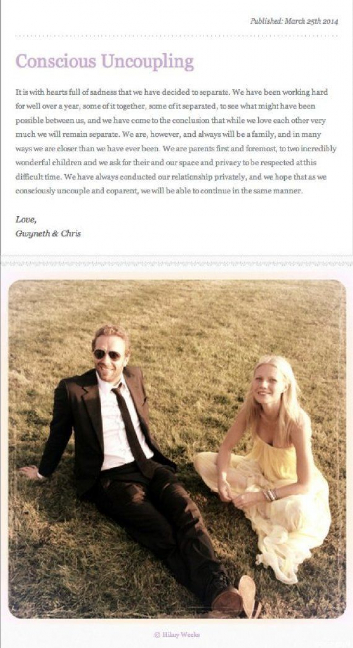 Paltrow, de 41 años, y Martin, de 37, firman un texto titulado titulado Conscious Uncoupling (algo así como separación de pareja responsable y deliberada) que ha dado para algún chiste en redes sociales, del tipo "eso da título para álbum de Coldplay". Esto es lo que explican: