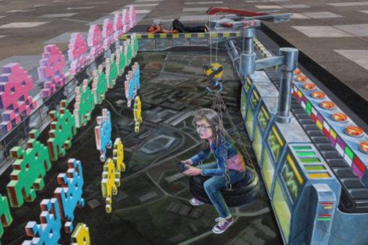 Uno de los más impresionantes autores del arte en las aceras en 3D, Leon Keer, es fan del arcadeSpace Invaders.