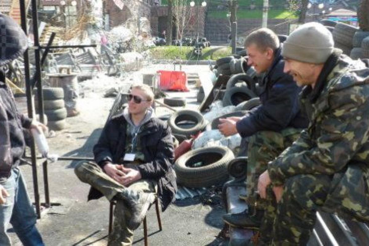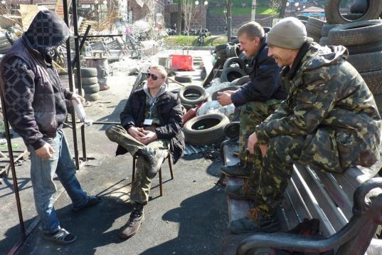 En teoría, estos grupos armados (con muletas, bates, barras de hierro cortas; a veces sale a relucir un fusil) siguen ahí como vigilantes del Maidán hasta las elecciones del 25 de mayo, por si el Gobierno provisional no da la talla o llegan los rusos. Mientras tanto, echan el tiempo frente a las hogueras como si esperasen una nueva ocasión para poder sentirse a gusto con su uniforme.