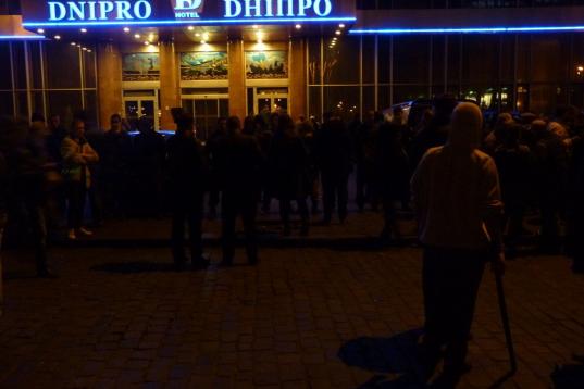 Policías y miembros del grupo Autodefensa rodearon anoche el Hotel Dnipro para desalojar, en principio, al grupo extremista Sector Derecho, que ocupa dos plantas. Decenas de personas aparecieron en uniformes desastrados, blandiendo bates y barras metálicas; había pasamontañas, chalecos, walkie-talkies. Circularon rumores de disparos y un herido fue sacado del hotel en brazos hasta un coche. Sobre las tres de la mañana sólo quedaban un puñado de policías soñolientos.