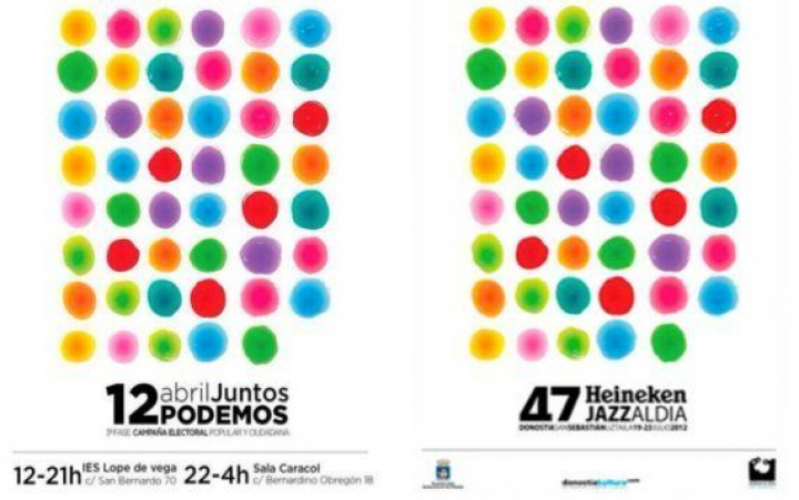 León se dio cuenta de la copia este lunes al ver un tuit de Pablo Iglesias en el que adjuntaba un cartel calcado a uno suyo que había sido finalista del 47 festival de jazz Jazzaldia de San Sebastián. La imagen de Podemos, que sirve como reclamo electoral para las elecciones europeas, está formada por 47 círculos de colores exactamente iguales y colocados en la misma posición que en el cartel de León.