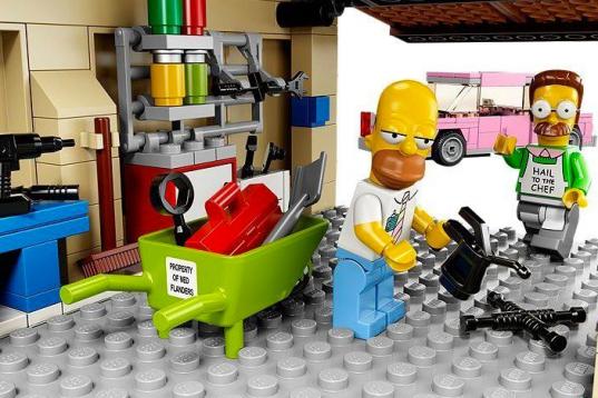 La colección Lego de Los Simpson no solo incluye a los miembros de la familia y otros vecinos de Sprinfield, sino que además incorpora algunos elementos claves en la serie como la casa de la 742 Evergreen Terrace (de la que hay una réplica real en Nevada), el garaje anexo donde Homer guarda sus herramientas y el coche rosa que tantas veces ha perseguido a Bart.