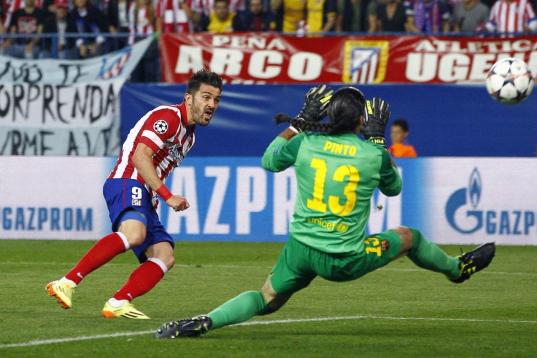 Así llegó el segundo balón al larguero, obra de Villa. El asturiano aprovechó la espalda de la zaga blaugrana y envió con la zurda el esférico a la madrea. Pinto hacía la estatua. Idéntico gesto que en el segundo lanzamiento al travesaño del 'guaje'. Un balón bombeado de Raúl García lo controló con la cabeza y sin pensárselo, disparó con la diestra hasta que el cuero golpeó el larguero.
