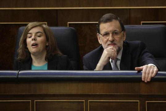 El presidente del Gobierno, Mariano Rajoy, y la vicepresidenta, Soraya Sáenz de Santamaría, durante la sesión del jueves en el Congreso, momentos antes de la comparecencia del líder del Ejecutivo para explicar lo acordado en la última reuni...