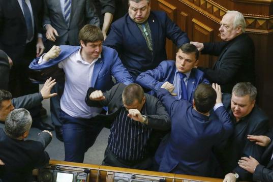 Varios diputados del partido nacionalista ucraniano Svoboda (Libertad) se lian a golpes con legisladores comunistas en el hemiciclo de la Rada Suprema de Kiev.